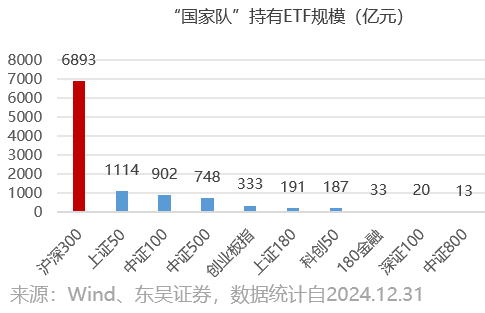 最关键的是,沪深300本身就具有巨大的虹吸效应。截至2024年末,300指数挂钩ETF规模达10442.67亿元,在所有指数中位居第一,而且在“国家队”持仓中,沪深300挂钩ETF的规模也是第一位。