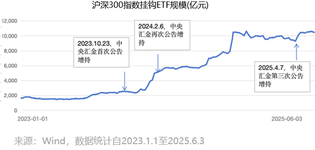 此外,自中央汇金2023年首次公告增持至2025年6月初,沪深300挂钩ETF规模已经大幅增长356%,十分吸金。