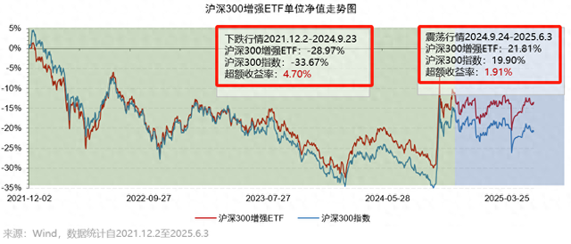 数据显示,沪深300增强ETF(561990)自2021年12月成立以来,已经连续三年跑赢基准,不管是下跌、震荡等不同行情,均捕捉超额收益,穿越不同市场风格。